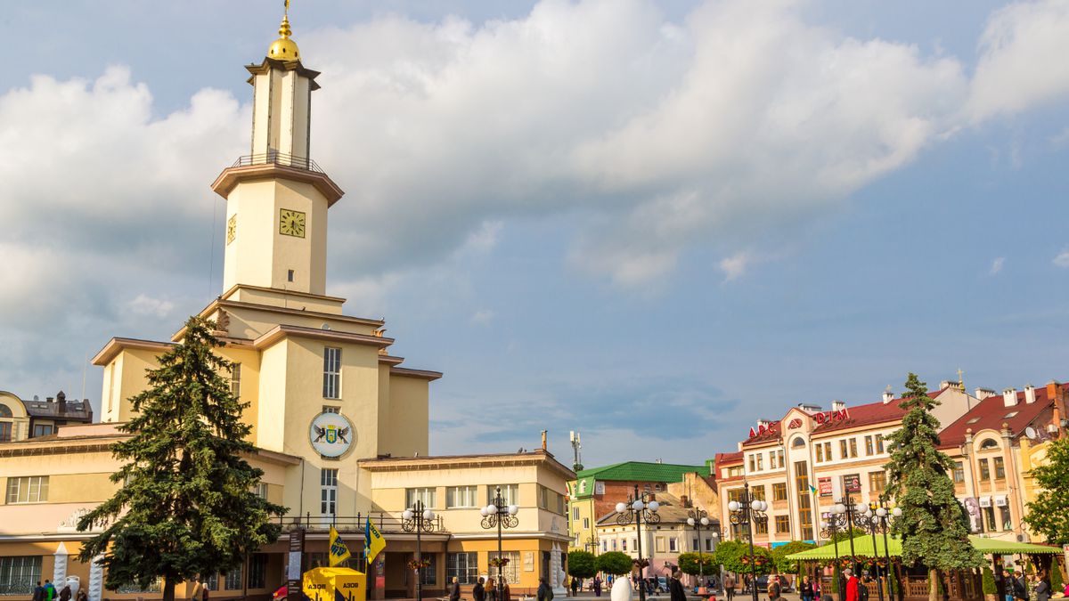Однією з головних визначних пам'яток міста є Ратуша - єдина в Україні увінчана позолоченим куполом у вигляді військового шолома, а годинник на ній виконує 12 українських мелодій. Висота споруди становить 49,5 метра. Сьогодні Ратуша є красою міста, однак вона багато разів змінювала свій зовнішній вигляд більш ніж за 300 років. Вперше вона була побудована 1672 року з дерева і каменю. Це була дев'ятиповерхова вежа в стилі пізнього ренесансу в якій розташовувалася міська управа, а також вона використовувалася як пожежна каланча. У 1695 році була побудована нова кам'яна Ратуша, яка стала найвищою будівлею в місті. Вона ще не одноразово змінювала свій вигляд після цього. Сучасну будівлю перебудували поляки в 1929-1932 роках до повного невпізнання.